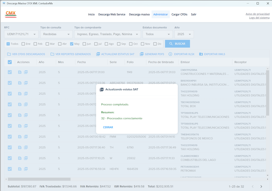 Gestiona y controla tus facturas electrónicas en un solo lugar. Con ContadorMX , descarga todos tus CFDI’s del SAT con nuestra app fácil de usar. ¡Simplifica tu contabilidad hoy!